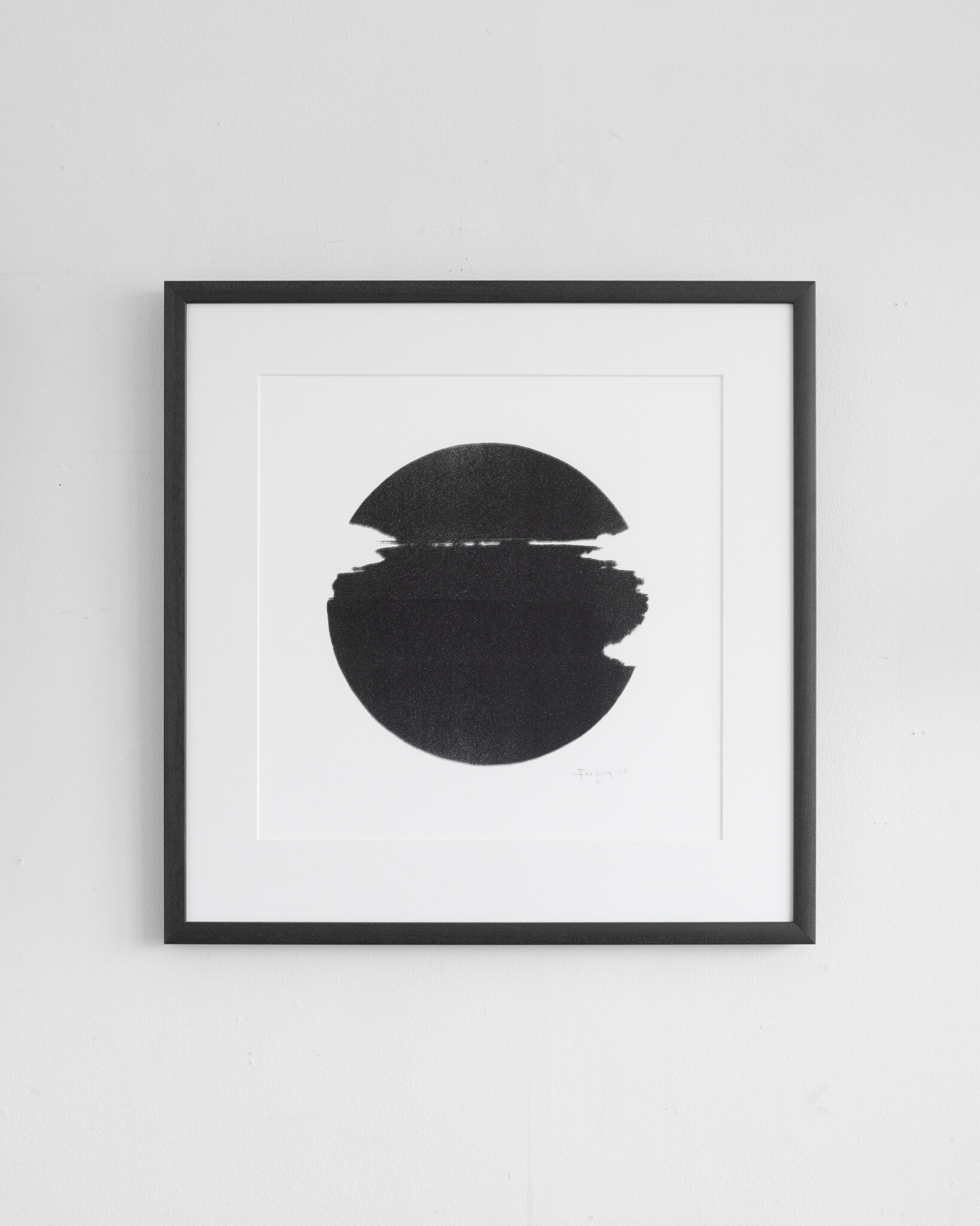 I arbeidet med å silketrykkja geometriske former, oppstår det det feilskjær. Slik som i dette tilfellet der sirkelen blir ufullstendig. Dette finn eg interessant og forma blir avfotografert og printa på film, som igjen blir nye silketrykk. Dette grafiske arbeidet er del av ein større serie av ulike variantar.