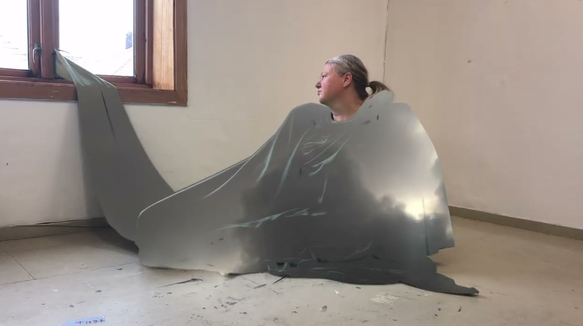 Performancevideoen gjorde jeg i atelierrommet på RKS. Her filmet jeg meg selv, som gjorde performance med en green screen. Etterpå la jeg en video av en solfylt himmel med lette skyer, inn i de grønne feltene. Surrealisme har alltid fascinert meg i den retning at det ser innover i oss mennesker og våre symbolske bilder av vår virkelighetsoppfatning. Dette gjør også verkene mine åpne på en måte som gjennom gjenkjennelse og egen fantasi inviterer publikum inn i tolkninger av bildenes betydninger.