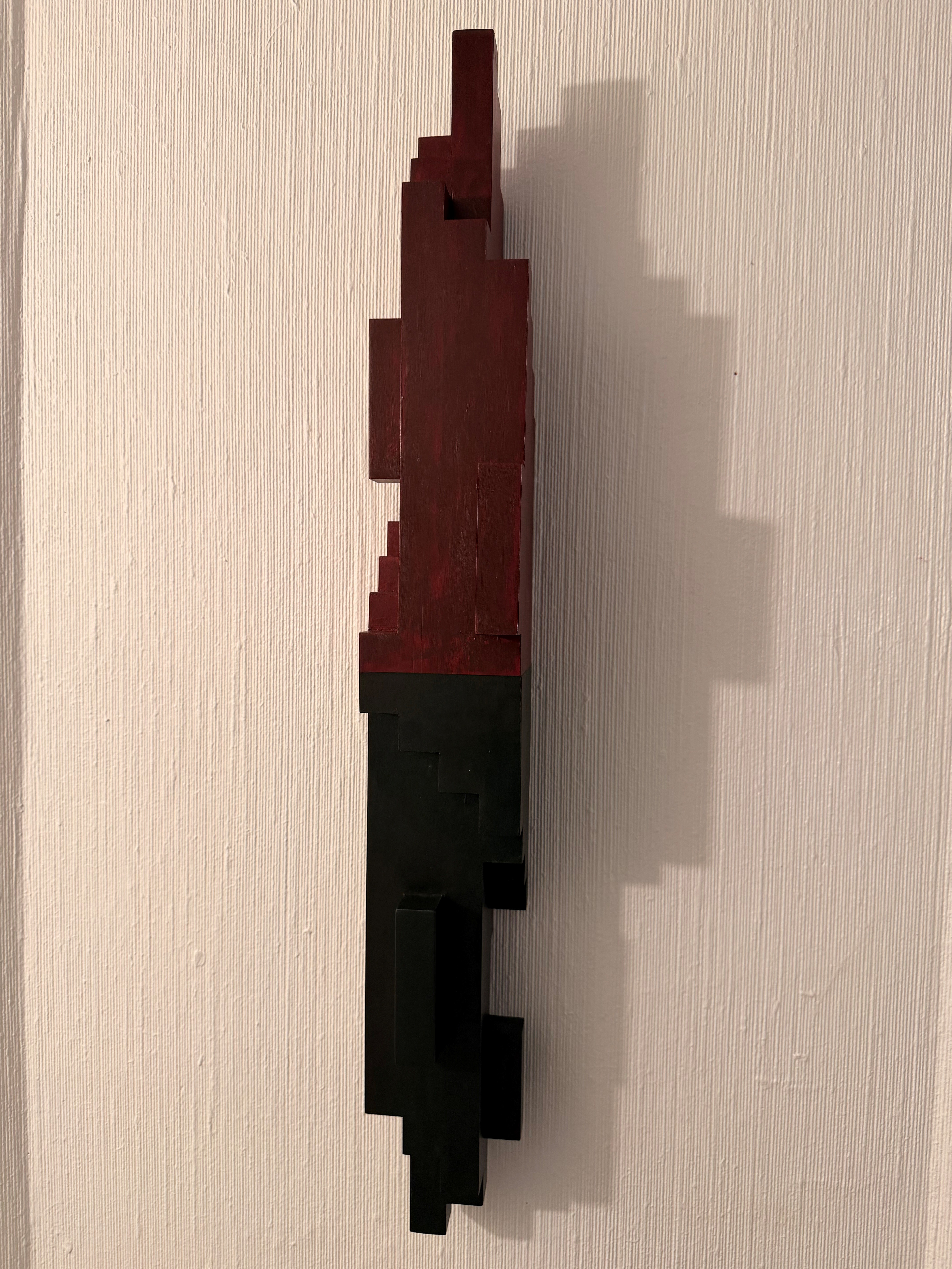 Vegghengt skulptur som er tenkt plassert på veggen i trapperommet sammen med 2 tilsvarende skulpturer. De tre er del av samme serie og er malt i de samme farger. Jeg ser for meg at én kan hengt i nedre del av trapperommet, den neste i midtpartiet og den siste i øvre del.