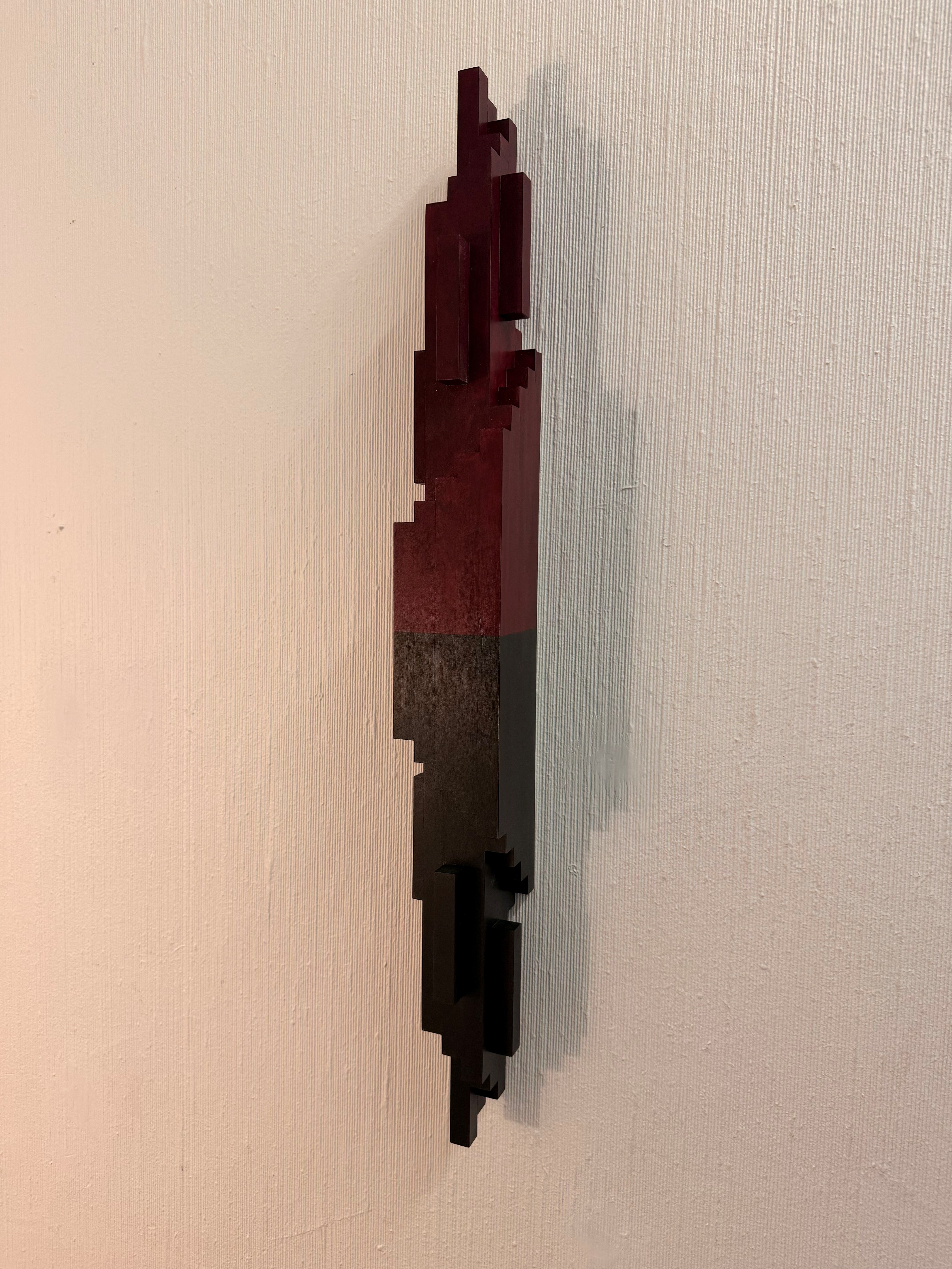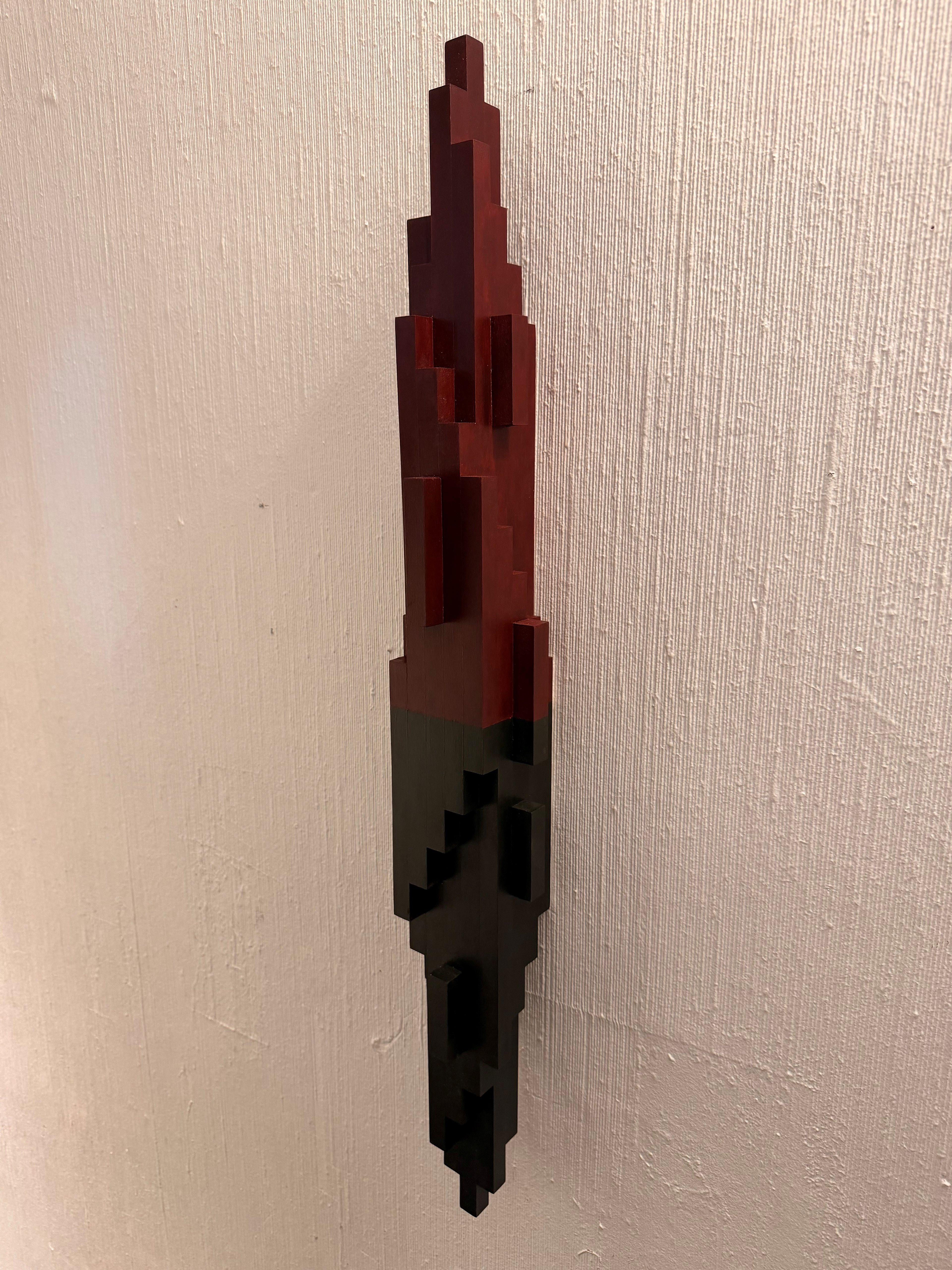 Det er en vegg hengt skulptur, vertikal, lang og smal. 2 like deler er satt sammen, den ene delen er montert opp-ned i forhold til den første slik at de danner en spiral trapp som går oppover og den andre nedover. Sammen danner de to delene et nytt objekt. Jeg ser for meg at 3 skulpturer i samme serie kan henger sammen i trapperommet. Plassert på veggen langs spiral trappen vil de danne et steds spesifikk installasjon.