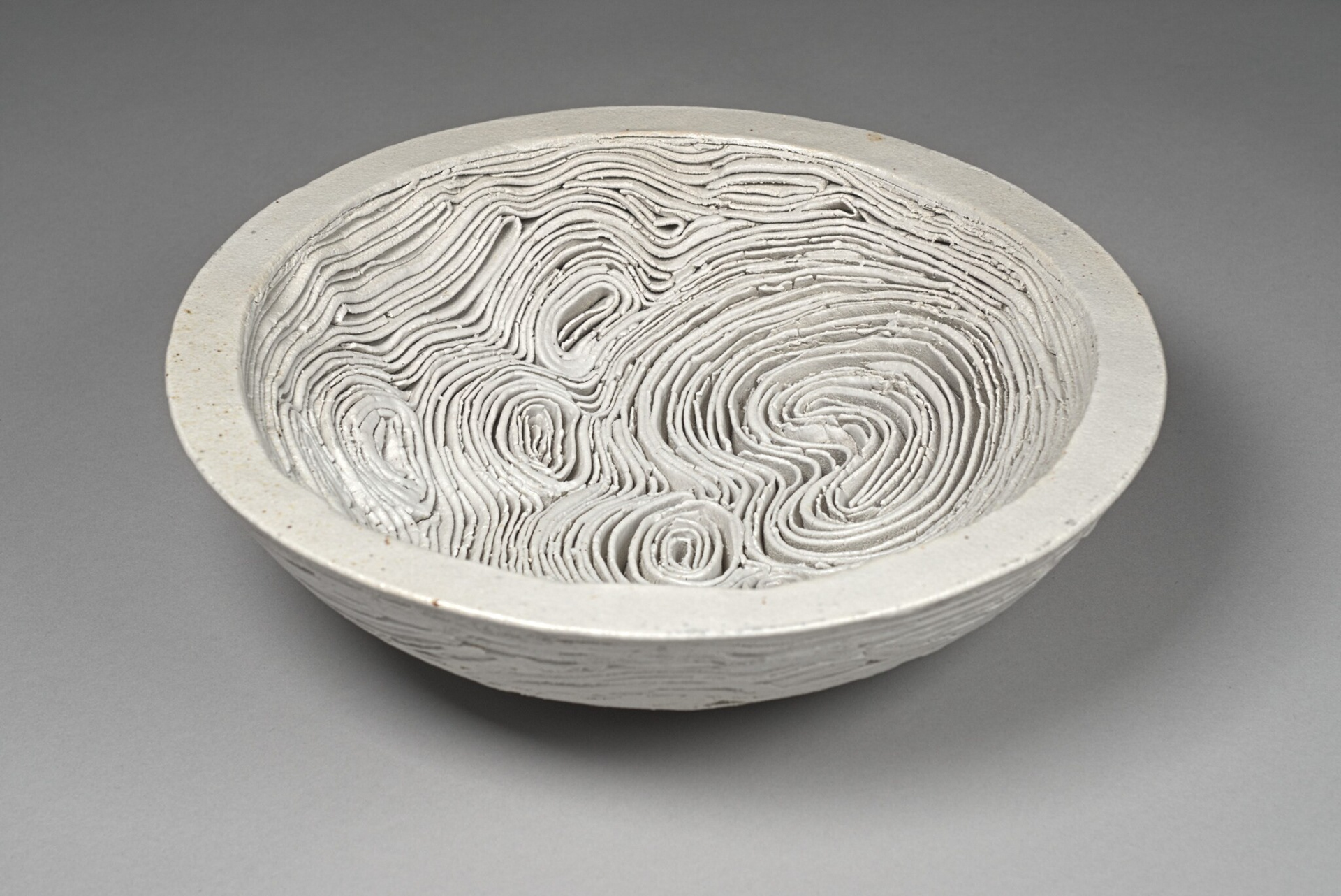 Utgangspunktet er ei gipsform eg klemmer mjuke leirstrimler ned i. Byrjar med ein spiral som vert avgjerande for korleis arbeidet utviklar seg vidare. Heile gips-forma vert fylt med leirstrimler. Strimlene må fylga spiralforma frå alle sider, bukta seg utover, oppover og nedover, laga ein struktur. Eg må fylgja intenst med for å finna ein balanse mellom ro og spenning. Eg går inn i ein prosess, fylgjer prosessen, samstundes styrer eg denne prosessen.