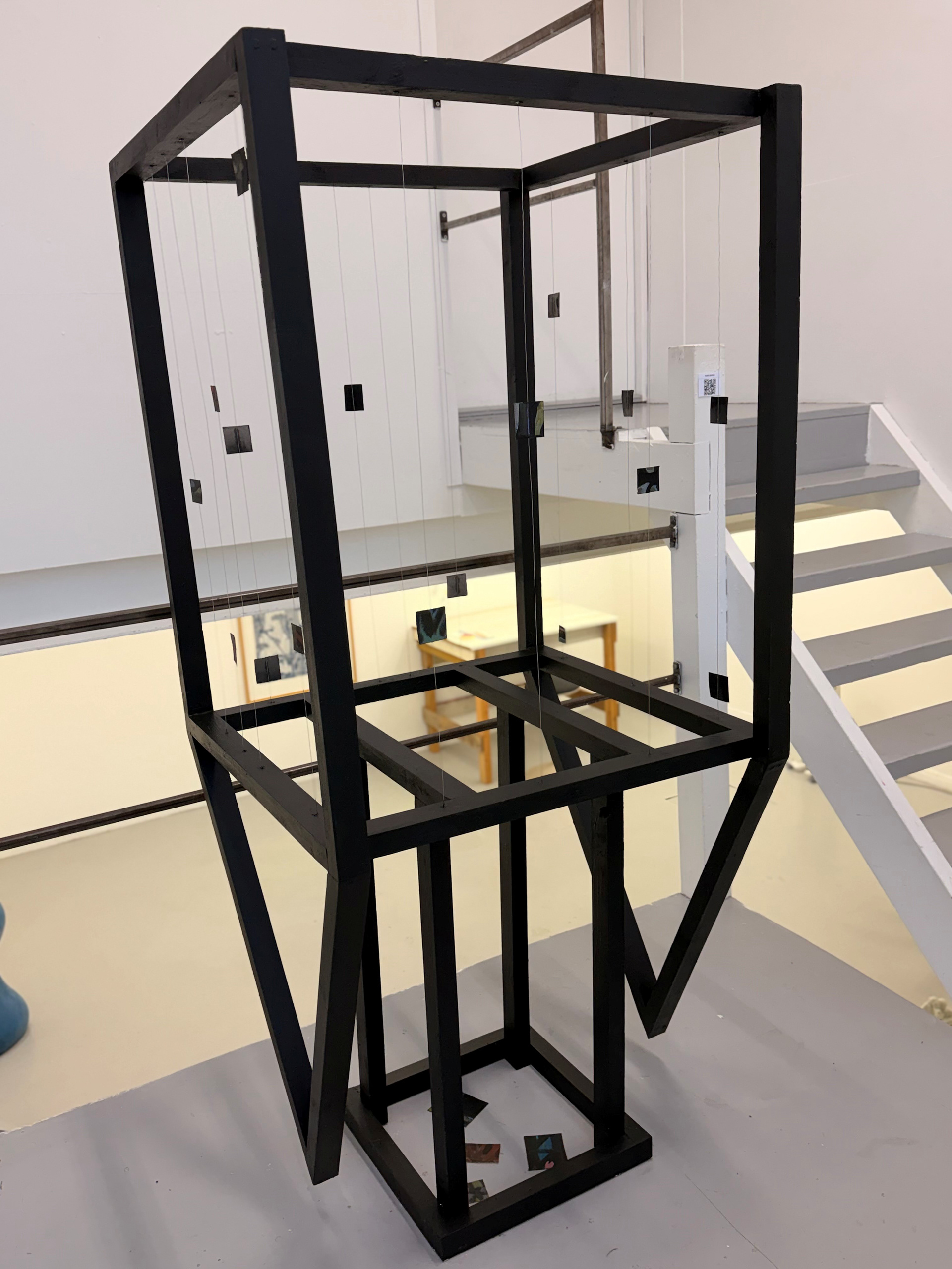 Teknikk: Tre, stålstrenger, akrymaling, lerret.