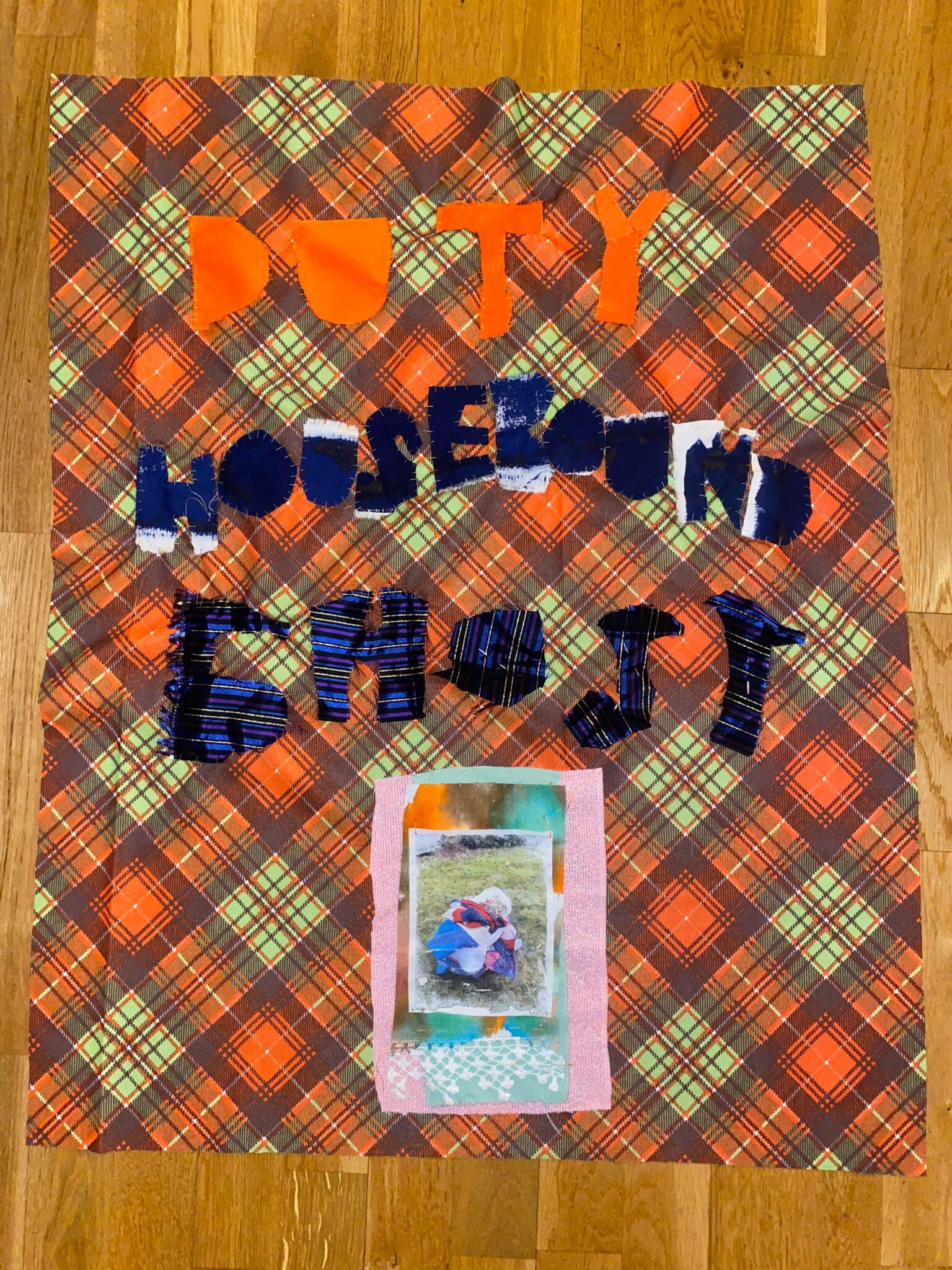 I dette arbeidet tar jeg utgangspunkt i forpliktelser, tilhørighet og hjem. Verket er et tekstilarbeid der ord er bygget opp av håndsydde bokstaver laget av tekstiler jeg har arvet fra mormoren min. Arbeidet inkluderer et fotografi på tekstil fra da jeg pakket og midlertidig la de arvede stoffene ut i hagen, som en måte å skape distanse på. Ordene duty, housebound og ghost peker mot plikt, bundethet og et vedvarende nærvær. Som kvinne som overtar en rolle og et hjem fra en annen kvinne, blir arven ikke bare materielt, men også knyttet til forventninger, omsorg og ansvar.