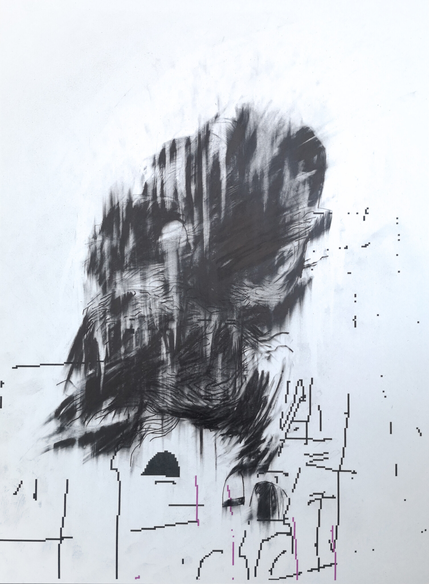 Each piece begins as an inkjet print composed of sparse pixel lines and geometric fragments, hand drawn using retro art software. minimal marks that suggest the language of data and compressed information. Onto this is drawn shapes and lines in heavy pencil, pushing the medium toward smudges, blurred masses, and organic disruptions. The drawings suggest a negotiation between two incompatible systems, the rigidity of the printed pixels and the intuitive motion of graphite smeared across the surface. The pencil marks refuse containment, they overwrite and distort the digital grid beneath them. What emerges is a hybrid space where structure dissolves into atmosphere. These works question what it means to make images in a world shaped by both algorithm and touch. They inhabit a liminal zone between order and erosion, signal and noise. They are records of interference. Computational, and material coexisting on the same surface.